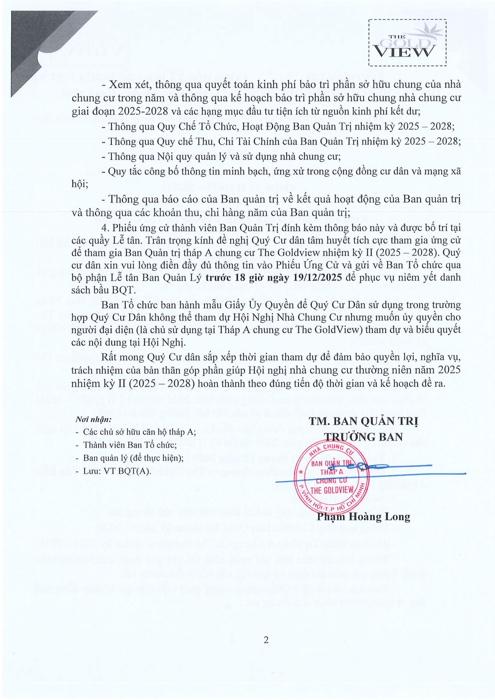 Thông báo tổ chức Hội nghị nhà chung cư thường niên năm 2025 nhiệm kỳ II (2025 – 2028)